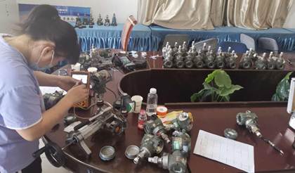 现场检定期间,工作人员严格执行计量器具检定规程,对检定合格的压力变送器、压力控制器加贴绿色合格“身份证”,出具检定证书;对出现偏差的及时进行调试,出现超差不能调试或损坏不能修复的一律停止使用,既保证了企业机器设备的正常运行,又避免了安全事故的发生。经过为期三天的检定工作,共检定压力变送器89台件,经检定调修后合格85台件,停用4台件;共检定压力控制器24台件且均合格。
