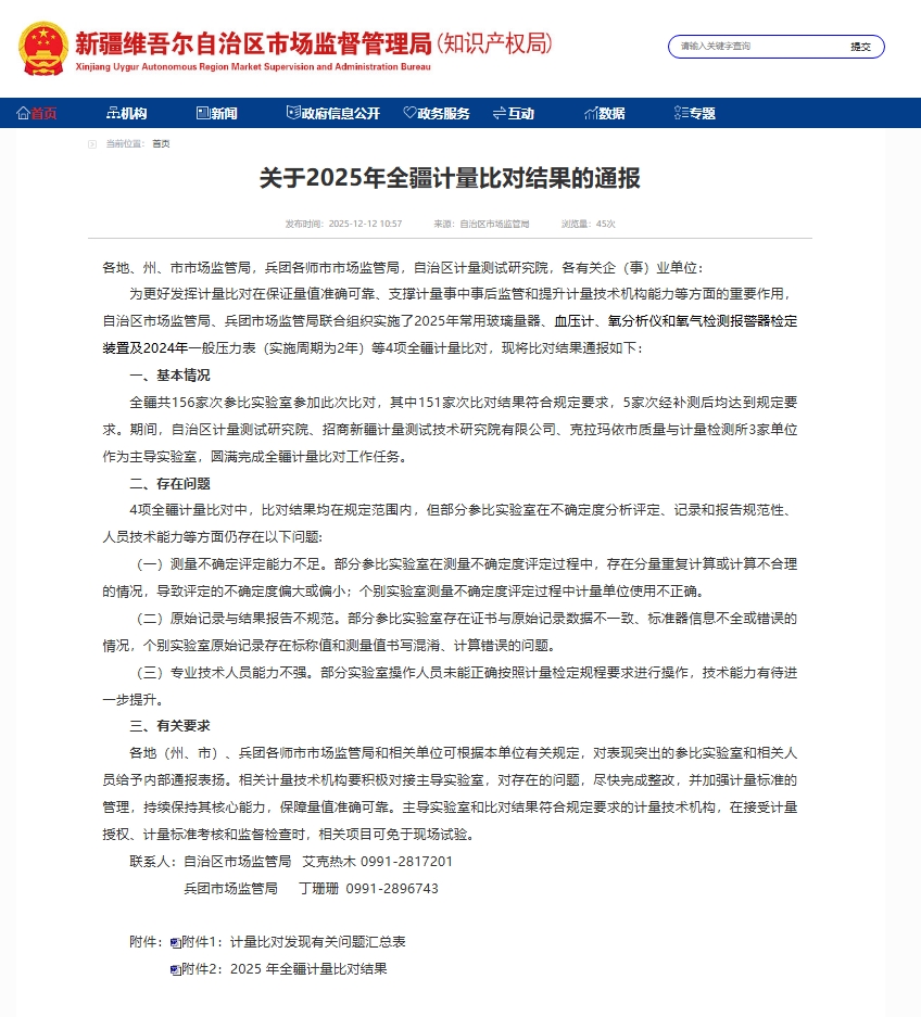 近日,新疆维吾尔自治区市场监督管理局发布《关于2025年全疆计量比对结果的通报》,新疆生产建设兵团第六师五家渠市市市场监管局综合所参加的常用玻璃量器、血压计2项计量比对项目结果符合规定要求,均获“满意”结果。