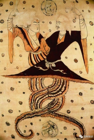 新疆吐鲁番出土的唐代遗物伏羲女娲图,伏羲左手举着矩,女娲右手举着规