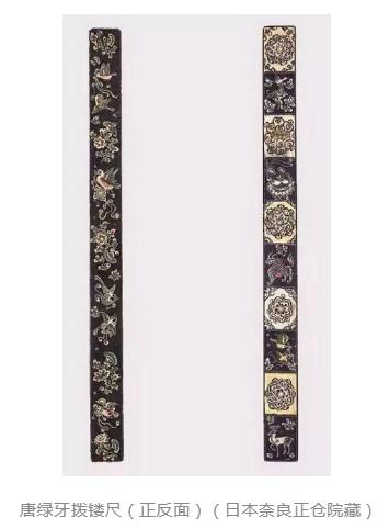 现存唐尺实物最有名的当属拨镂牙尺和铜尺,拨镂牙尺以精细线条刻绘人物、鸟兽、花卉、亭宇的轮廓,极浅地雕镂其凹人部分,给人以玲珑剔透和立体感,在尺面或花纹内敷以艳丽的色彩,异彩纷呈,反映了唐代高超的牙雕工艺。现存拨镂牙尺仅10支,国内仅有1支藏上海博物馆,其余9支在日本藏:神户市白鹤美术馆藏镂牙尺1支,奈良正仓院藏拨镂红牙尺6支,拨镂绿牙尺2支。