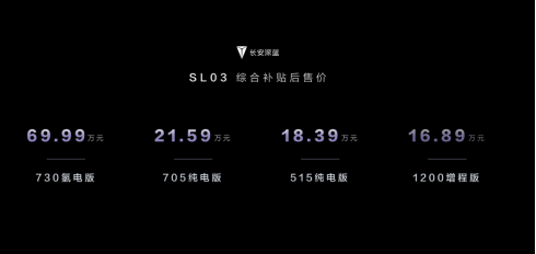 作为新品牌的开篇之作,长安深蓝SL03搭载多项全球首发及行业率先量产的技术,实现了在智能、续航、三电领域的三大超级突破。在本次上市发布会上,共推出纯电版、增程版、氢电版三种能源形式、4款配置版本的车型,并将提供包含哑光车漆、多种内饰CMF、运动轮毂、高阶智能驾驶辅助服务等个性化选装来满足用户的多样化需求,新车的官方指导价16.89-69.99万元。