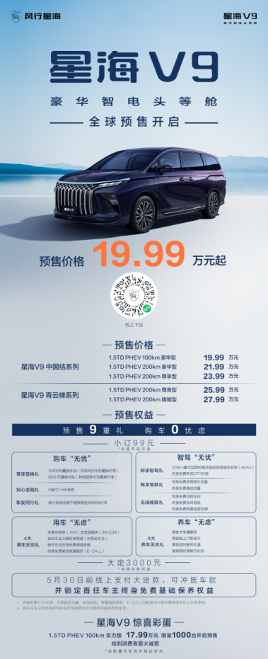 同时,风行星海V9也为下订车主准备了豪华的“预售9重礼”大礼包。预售期即刻交付99元定金,即可享受包括【尊享置换礼】东风风行老车主置换享10000元置换补贴,其他品牌车型置换可享8000元置换补贴;【贴心金融礼】0首付1-5年低息,更有【挚友同行礼】、【即享智驾礼】、【畅享智联礼】、【无线畅联礼】等至诚至意的购车政策,保障准车主们购车无忧、智驾无忧、用车无虑、养车无虑。5月30日前线上支付3000元大定款,可冲抵车款,并锁定首任车主终身免费基础保养权益,让用户轻松享受购车的高品质体验与服务。值得一提的是,东风风行还给用户带来惊喜彩蛋,限量预售1000台1.5TD PHEV 100km实力版车型,预售价只需17.99万元,给到消费者最大的诚意(该配置车型详情请到店咨询)。