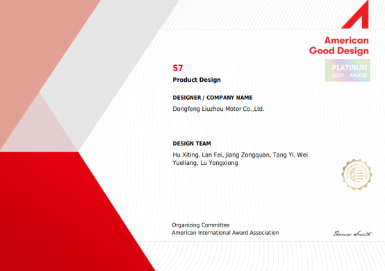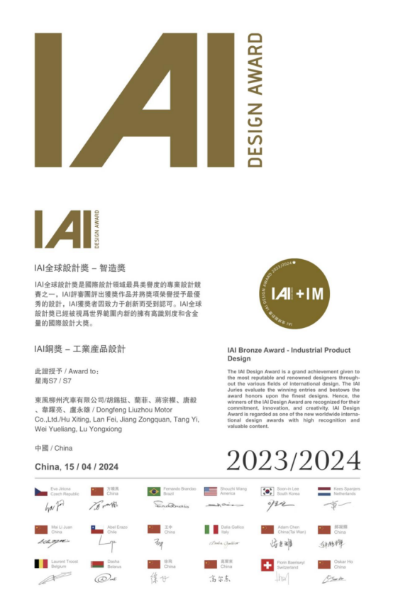 凭借其独特的产品设计“辨识度”,风行星海S7还成功斩获美国好设计奖、亚洲设计奖、亚太IAI设计大奖的殊荣,登顶国际设计舞台,助力东风风行乃至自主汽车设计审美走向新高度。