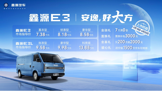 鑫源E3作为“安逸,好大方”全新车型,共推出鑫源E3、鑫源E3L两个车型,分别有基础型、标准型、豪华型、科技型等6款配置,指导价7.38万元-13.88万元。上市还推出新车上市权益包:1、金融礼-7万真0息;2、置换礼-置换补贴3000元;3、金喜礼-交200抵2000元;4、暖心礼-送价值1500元全车铝地板。鑫源E3以“一寸长·一寸强”、“移动家·头等舱”和“好·省”三大核心卖点,为新能源城配物流树立新标杆!