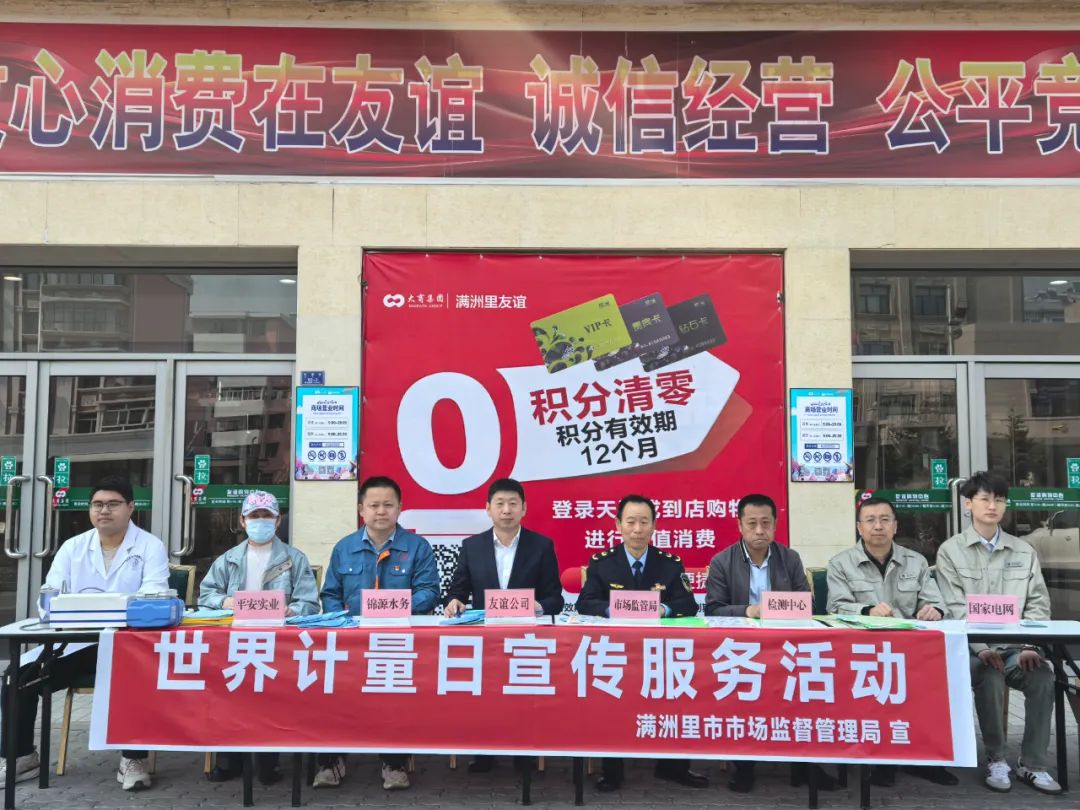 为积极响应 2025 年世界计量日“计量顺时代之需,应民生之盼”主题号召,在第26个“世界计量日”(5月20日)来临之际,满洲里市市场监督管理局联合满洲里市检验检测中心、国网满洲里市供电公司、大商友谊商贸有限公司、锦源水务公司、平安实业公司,在友谊购物中心门前组织开展了“5·20”世界计量日宣传服务活动。