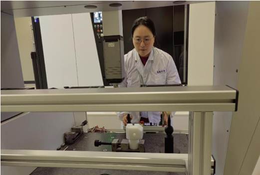 恒温室内一片安静,空气中飘散着湿润的气息,墙壁上的温湿度表显示温度20℃,湿度50%,长度室的施山菁说,恒温室内部温度全年要保持在恒温(20℃±2℃)、恒湿(30%~70%)的环境条件下,这样才能使测量设备随时随刻保持高精度高效率工作。从9时开始到临近中午吃饭,都没有离开过操作台,之后与客户讲解了三坐标测量,她说三坐标是检验工件的一种精密测量方法,广泛应用于机械制造业,汽车工业等现代工业中,三坐标检测是运用三坐标测量机对工件进行形位公差的检验和测量。判断该工件的误差是不是在公差范围之内,从而完成零件检测、外形测量、过程控制等任务。施山菁说要确保每个检测器具的准确无误,是我们的神圣职责。胸怀梦想,脚踏实地,她用热血和青春书写着精彩的计量之路。