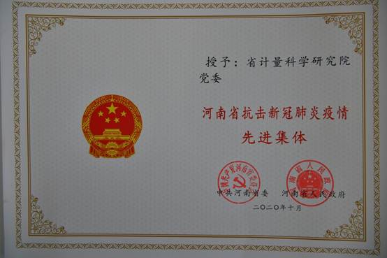 10月21日,河南省抗击新冠肺炎疫情表彰大会在郑州隆重举行。河南省计量科学研究院党委被中共河南省委表彰为:河南省先进基层党组织;被中共河南省委、河南省人民政府表彰为:河南省抗击新冠肺炎疫情先进集体。