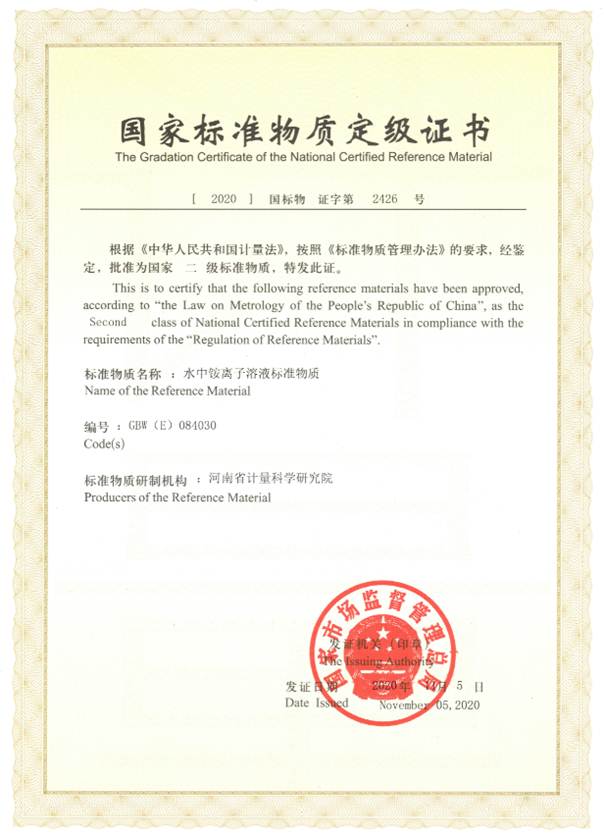 据悉,标准物质是化学计量中的参考标准,主要作用为校准测量仪器、评价测量方法或为材料赋值。这两项标准物质研发成果,不仅为河南省水质检测领域仪器的量值溯源提供了技术支撑,还为环保领域的新技术新方法研究、新标准验证、质量控制、能力验证样品检测等方面提供技术保障。其中,水中氨氮溶液标准物质主要应用在环保水质监测中,对排放的氨氮污染物进行准确测定。一方面有利于企业对污染物排放进行管理,提升污染治理水平。另一方面有利于政府履行环保监管职能,为河南省“碧水”、“净土”保卫战提供科学的技术支持;水中铵离子溶液标准物质用于测定大气降水中相应化学成分,是大气污染测定的关键指标,为河南省大气污染防治攻坚战提供技术保障。这两项成果具有较高的社会意义和推广价值。