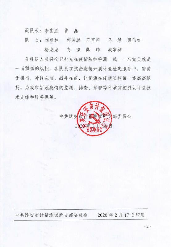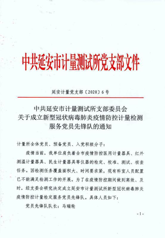 按照延安市市场监管局对新型冠状病毒肺炎疫情防控工作部署,为进一步振奋精神,激励斗志,切实发挥党员先锋模范作用,以决战决胜的姿态坚决打赢疫情防控这场硬仗,延安市计量所成立了疫情防控计量检定服务党员先锋队。