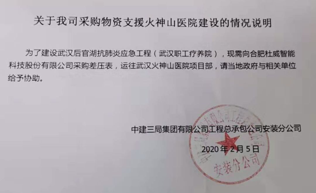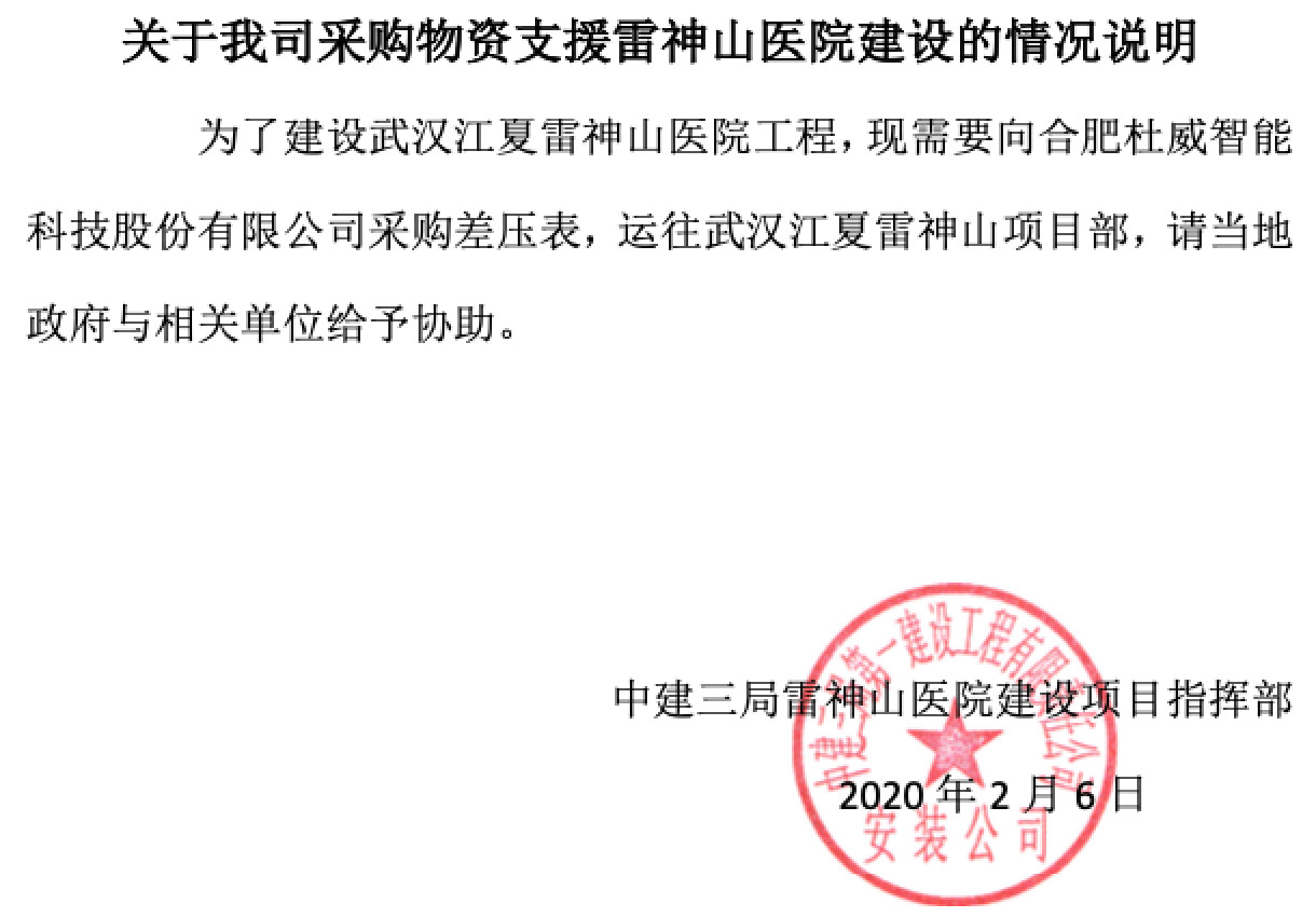 武汉疫情发生后,合肥杜威智能科技股份有限公司积极承担社会责任,于1月27日向武汉新型肺炎防控指挥部捐赠了100台指针式微差压计,用于火神山差压病房的建设。随后又加班赶制几百台的微差压计驰援武汉双神山医院的建设。