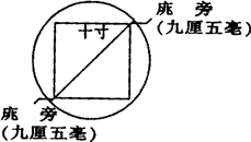 答:每边10寸的正方形,其对角线长:△=14.142135寸,加庣旁九厘五毫(0.095寸),铜斛底圆的直径为:14.142135+2×0.095=14.3321356寸,半径为7.1660678;可求得刘歆的圆周率:π=162÷(7.166)2=3.1547。